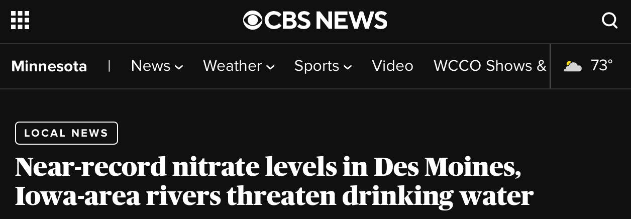 The ongoing nitrate pollution contaminating the Des Moines area drinking water supply is probably the biggest environmental story in Iowa since the 2013 nitrate episode, which led to the Des Moines Water Works lawsuit seeking relief from three upstream counties in the Raccoon River watershed. Then governor Terry Branstad said Des Moines was declaring war on rural Iowa, agribusiness giants rushed to fund the defense of the three counties, Art Cullen won the Pulitzer Prize for reporting on it, Republicans in the legislature threatened to take over the water works, the Des Moines mayor hung then-DMWW general manager Bill Stowe out to dry, the lawsuit was dismissed, and Stowe died. And to the surprise of literally no one and over the objections of almost nobody in Iowa’s political establishment, agriculture went right on its merry way polluting Des Moines’ drinking water.