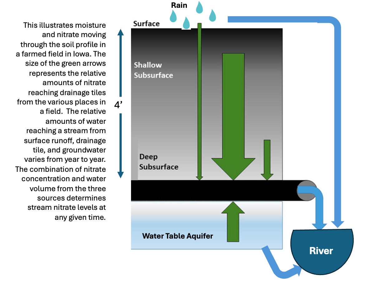 The 2013 event was the logical consequence of severe drought beginning in the second half of 2011 and lasting until March of 2013, after which the heavens opened their floodgates and the next two months’ deluge resulted in some of the wettest weather in Iowa history, and the worst loss of nitrate from farm fields ever recorded. Instead of bleeding off continuously into the stream network as happens during normal rainfall regimes, surplus nitrate unused by crops builds up in the soil profile during drought and when the rains return a massive slug of constipated nitrate is blown out of the colon of Iowa’s farmed landscape—agricultural drainage tile (pipes) that lower the water table in cropped fields.
