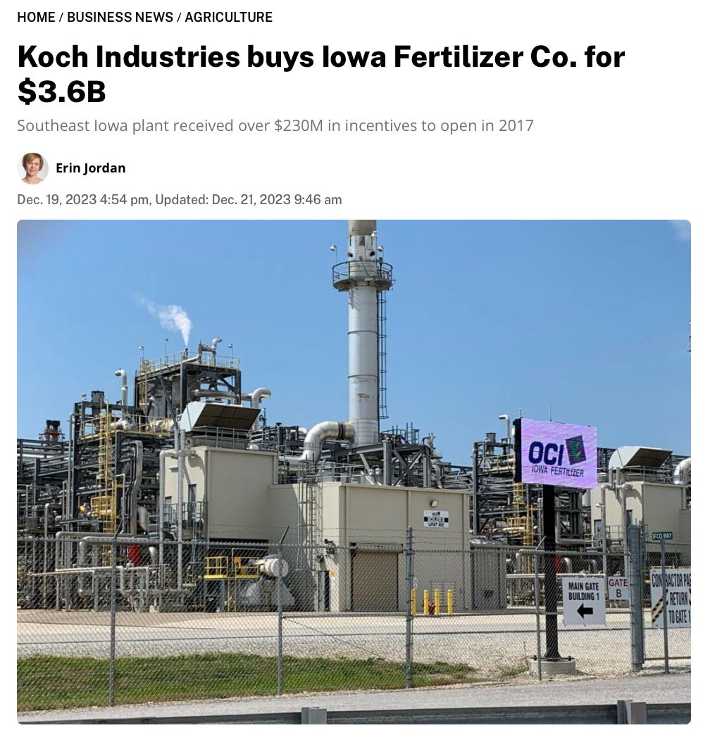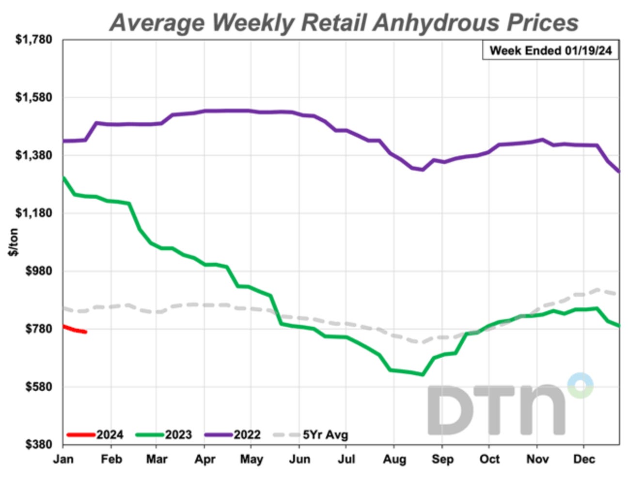 Here at RiverRaccoon.substack.com, we track the price of nitrogen fertilizer, so you don’t have to. Today our top staff person noticed that the price of anhydrous ammonia (contained within those white cylindrical tanks you see parked all over rural Iowa) was $770 per ton, which is pretty darn low. That pencils out to $0.385/lb, but since ammonia is 82% nitrogen (N) by weight, the price of the nitrogen itself is $0.47/pound. This is about ½ as much as in 2022, when Vladimir Putin had everybody thinking he was about to lay claim to Europe’s best farm ground in Ukraine.