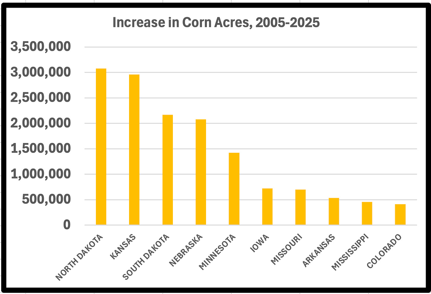 Other states, however, had a greater diversity of crops they could displace with the King. In the 21 years from 2005 to 2025, another Iowa was created within the borders of just 6 states: North Dakota, Kansas, South Dakota, Minnesota, Nebraska and Missouri. Translation: the increase in corn acres in those states alone matched the existing corn acres in Iowa.