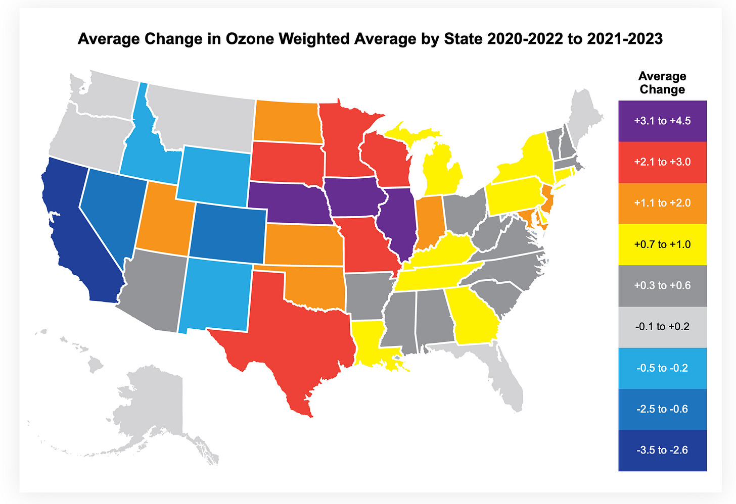 Remember that E15 increases ground level ozone and smog. Below is a map showing the changes in ozone levels by state over the past few years, this from the American Lung Association.