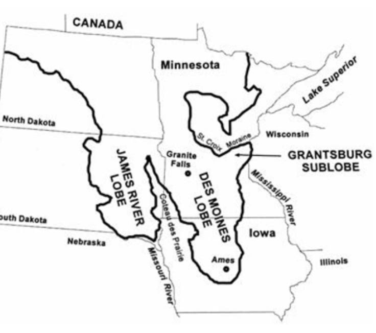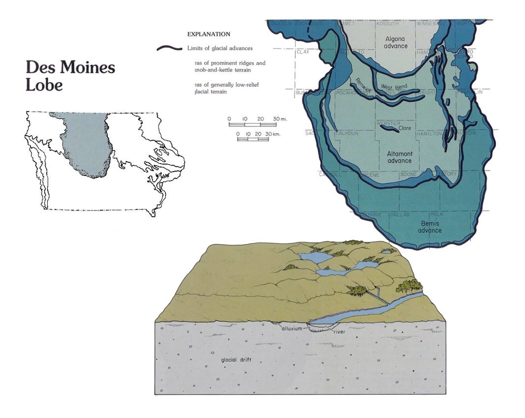 The area of Iowa covered by the Wisconsin glacier is now called the Des Moines Lobe. There’s some thought that the Des Moines Lobe ice and that of the similar James River Lobe to the west were the result of water melted beneath and as a result of the enormous glacial ice pressure to north. That melt water then refroze as it flowed south. Essentially these lobes of ice were squeezed out from beneath the main body of the ice cap.