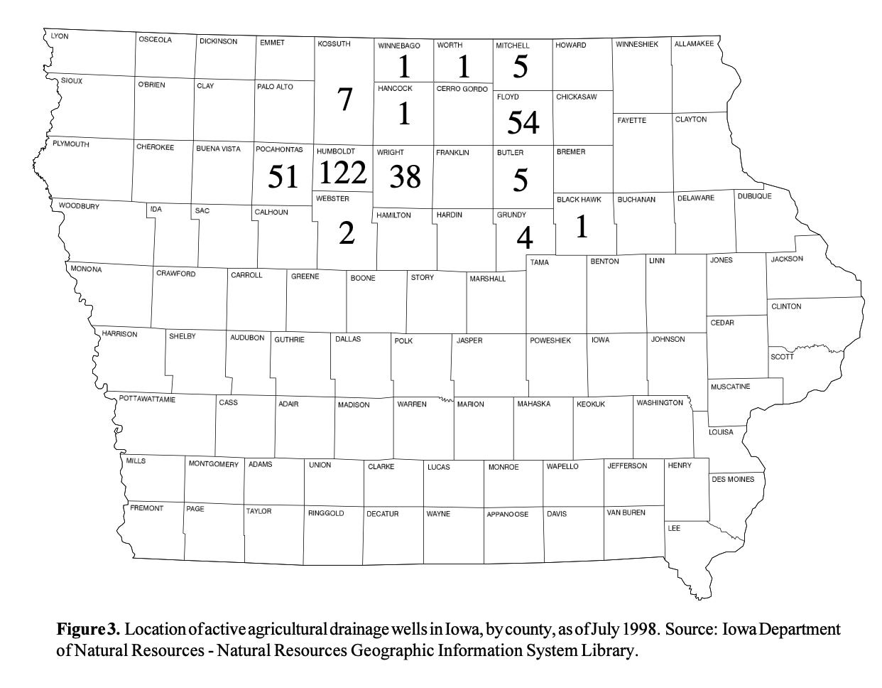 Seigley, L S; Quade, D J; Skopec, M P. Groundwater quality response to closure of agricultural drainage wells in Floyd County, Iowa. Iowa Geological Survey Bureau Technical Information Series 40. July, 1999.