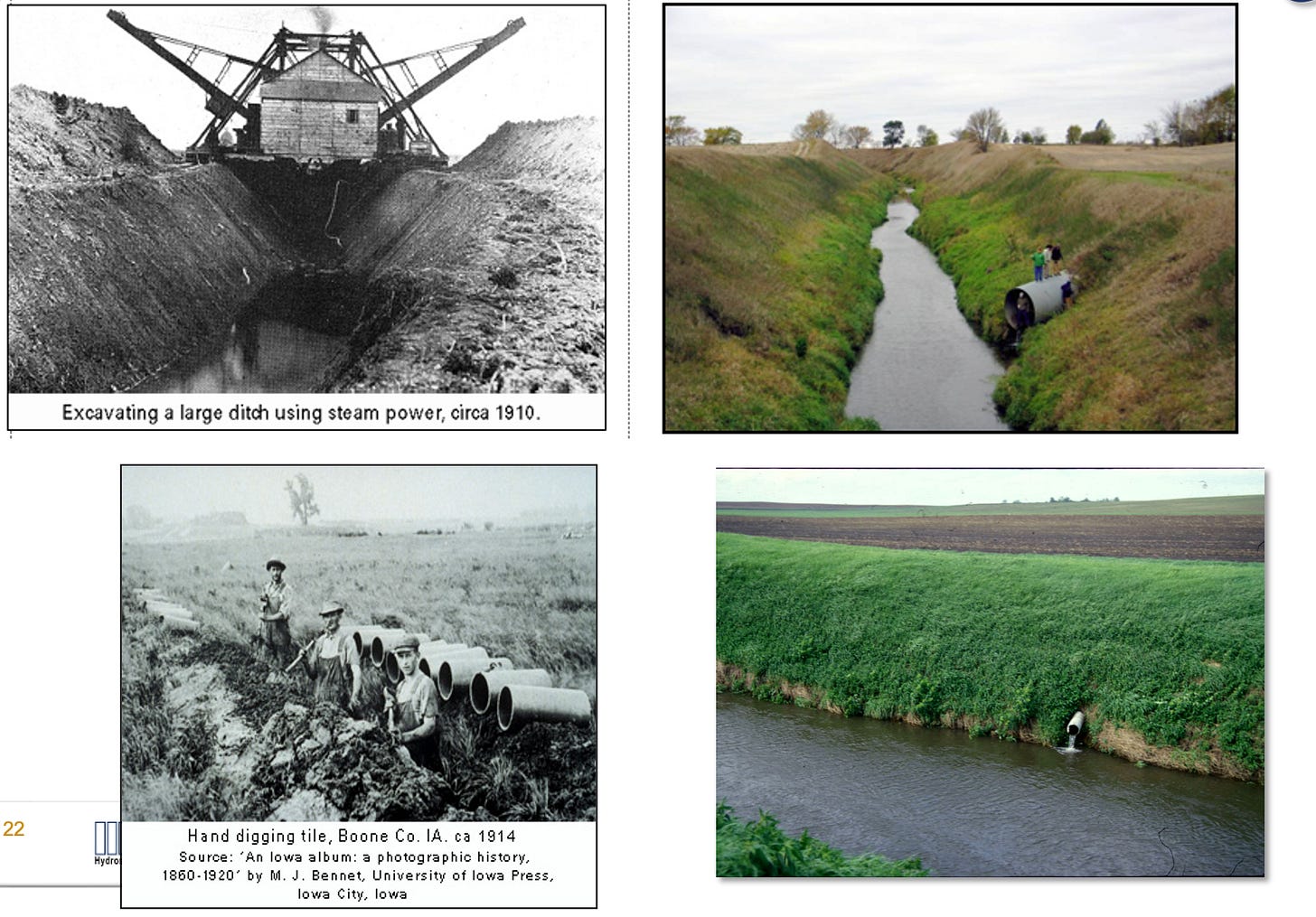 What Mother Nature couldn’t do in 11,000 years, e.g. form streams, newly arrived white people did in a few decades. Steam shovels dug trapezoidal ditches to connect upland areas to the sparse stream network that did exist, namely the North Raccoon, Des Moines, South Skunk, and the upper reaches of the Iowa and Cedar Rivers. Clay field tiles (pipes that collected subsurface water) were installed four feet down, lowering the water table and depriving the potholes of the water which was now discharged into the constructed ditches. The Lobe was sucked dry from below and an entire wetland ecosystem went quietly into the night over the course of a century (1850-1950).